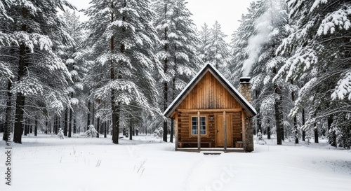 Wooden cabin in snow covered pine forest with smoke from chimney winter pine trees