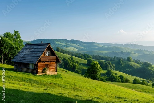Wooden cabin on a grassy hill with rolling hills in the background.