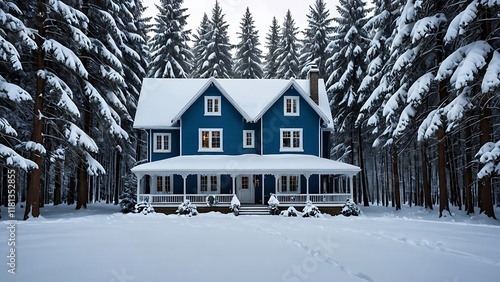 Wooden cabin surrounded by snowy forest in peaceful winter landscape with tall trees
