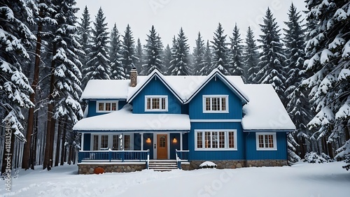 Wooden cabin surrounded by snowy forest in peaceful winter landscape with tall trees