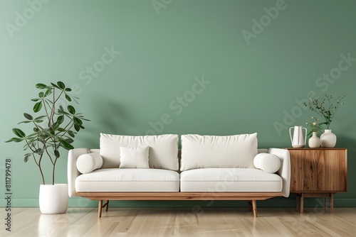 Wooden cabinet and white sofa against green wall. Scandinavian interior design of modern living room, home.