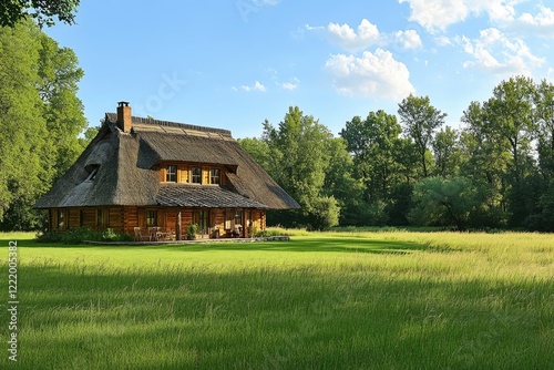 Wooden cottage with thatched roof nestled in lush green meadow