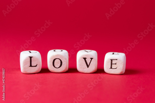 Wooden cubes with the words LOVE YOU on a red background. Valentine's Day concept