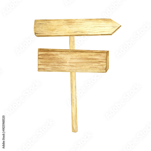 Wooden directional sign watercolor illustration in warm brown tones. Perfect for rustic-themed events, travel-themed decor, digital artwork, and countryside designs