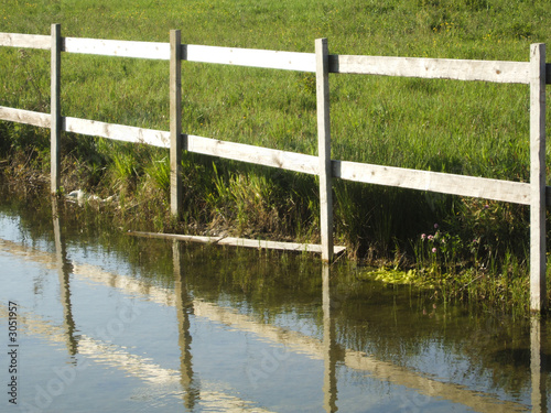 board, coast, construction, farm, fence, grass, lake, new, part, reflections, simple, sun, water, wooden