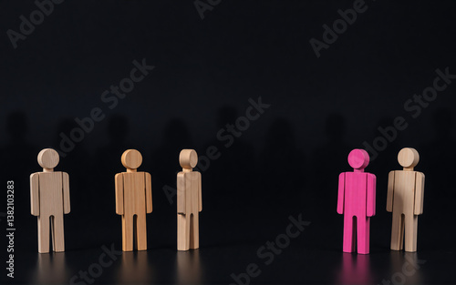 Wooden figures in beige and pink tones are positioned on a dark surface. The pink figure stands out amongst the beige group, emphasizing individuality and contrast.