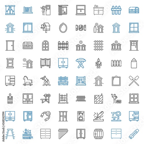 wooden, icon, set, vector, flute, chest, of, drawer, barrel, closet, stool, toy, wood, door, window, floor, fence, abacus, bench, door, oar, cabin, marshmallow, trojan, horse, feeder, room, divider, cabin, window, birdhouse, illustration, symbol, signs, isolated, design, black, graphic, element, outline, home, white