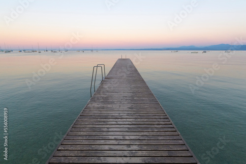 Wooden jetty on Lake Gardo (Lago di Garda) at dawn in Bardolino in Veneto, Italy