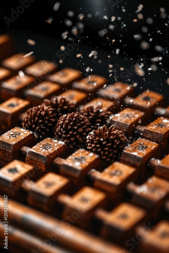wooden, keyboard, pine, cone, winter, nature, decor, brown, close, up, macro, object, detail, still, life, texture, pattern, decorative, ornamental, design, art, photo, closeup, detail, creative, cone, sharpened, lighting, dark, background, grain, surface, object, still life, image, photo, closeup
