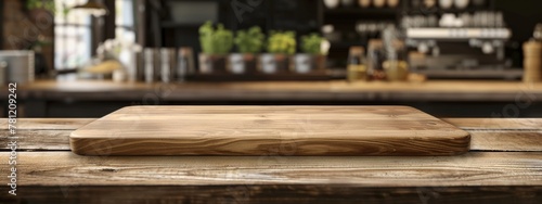 Wooden kitchen table with empty wooden board for product presentation on blurred background Blurred Empty Wooden Table Background Cafe Restaurant Table, Wooden Table, Copy Space. Product Photography