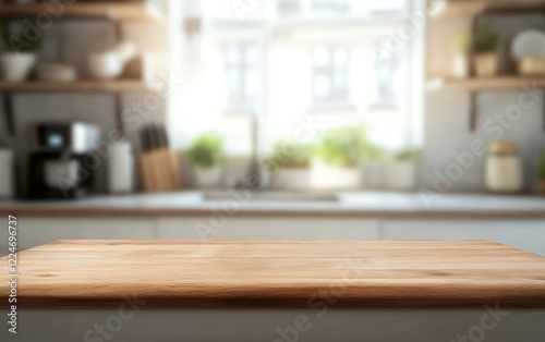 Wooden kitchen tabletop in a bright and modern kitchen with shelves, appliances, and natural plants for a fresh look