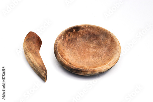 Wooden mortar and pestle (Cobek and Ulekan) is an Indonesian Kitchen utensil for making Sambal or spicy sauce. Mortar and pestle isolated on white background.