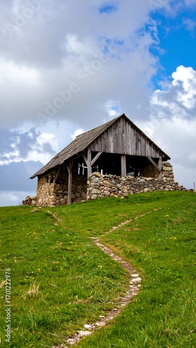 hut, mountain, nature, grass, hill, path, wooden, cabin, landscape, sky, cloud, travel, hiking, tour tourism, beauty, scenic, exterior, view, idylli, peaceful, rustic, trekking, outdoors, explore, vacation