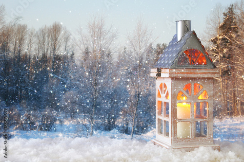 Wooden old house with candle over the snow and blurry magical winter landscape background.
