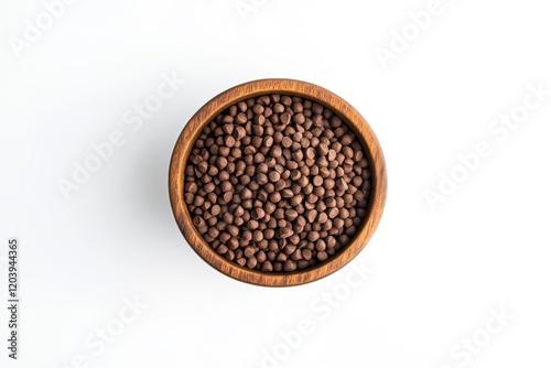Wooden pellet cat litter in bowl setup, aerial view on clean backdrop for modern pet care enthusiasts looking for eco-friendly options