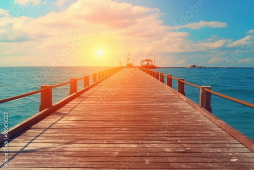 Wooden pier on ocean or sea at sunset, perspective view