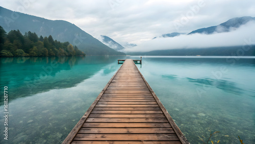 Wooden pier on the lake. Wooden quay misty mountains with lake dock background. Empty extending wooden pier on a turquoise blue lake. Tranquil dock, serene wooden dock extending into a misty mountain
