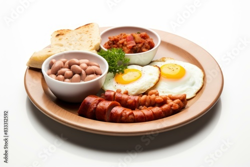 breakfast, egg, sausage, bean, toast, wooden, plate, hearty, meal, white, background, morning, fried, baked, food, photo, alimentary, protein, english, traditional, cooked, epicure, sunny, side, up, parsley, tomatoes, sauce, sausage, fiber, bread, meat, egg, yolk, styling, balanced, homemade, presentation, delicious, brunch, isolated, tasty, comfort, healthy, culinary, time, cookery, appetising