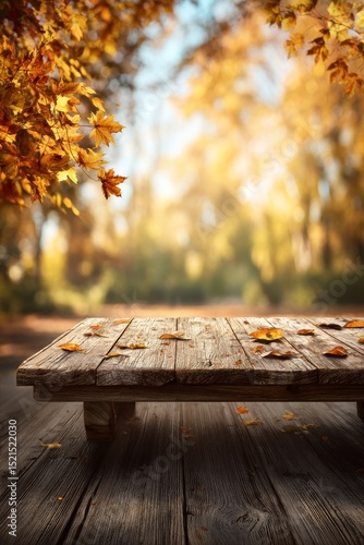 Wooden Platform Adorned With Autumn Leaves in a Peaceful Forest Setting During Golden Hour