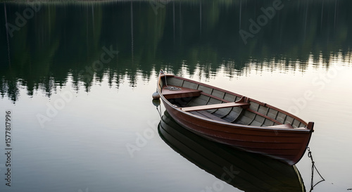 Wooden Rowboat Floating on Calm Water Reflecting in the Surface Tied with Rope.