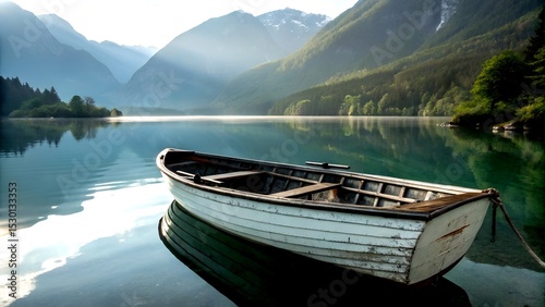 "Wooden Rowboat Floating on Tranquil Mountain Lake"