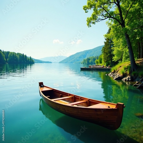 Wooden rowing boat in calm waters with trees nearby, docked, lake, marinas