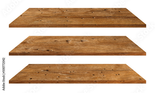 Wooden shelves isolated on white with clipping path, Wood table top, Template mock up for display of product