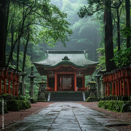 shrine, shinto, forest, rain, lantern, stone, moss, wet, path, wooden, traditional, spiritual, nature, greenery, ritual, torii, sacred, peaceful, japan, ancient, building, serene, step, religious, calm, tree, tranquil, architecture, entrance, misty, lush, overcast, foliage, zen, moist, timberland, sanctuary