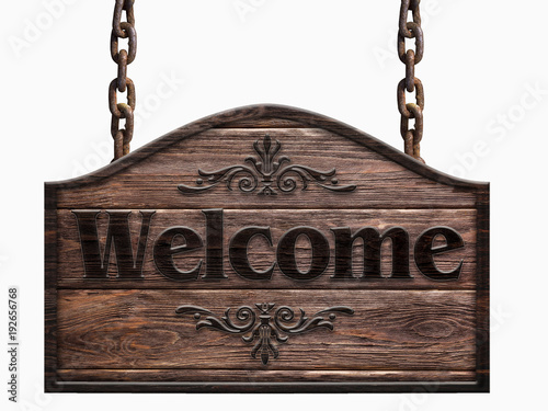 Wooden sign in a dark wood with the words welcome hanging on a chain isolated on white background