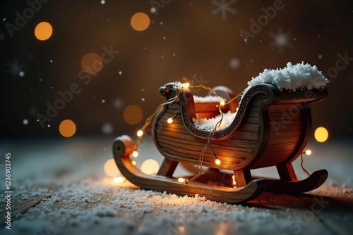 Wooden sled with Christmas lights and snowflakes, warm, wood