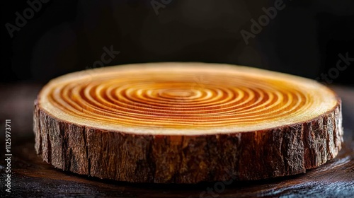 Wooden slice with concentric rings on dark background.