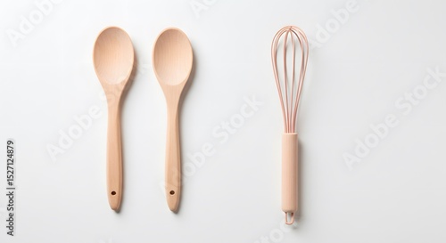 Wooden Spoons and Pink Whisk - Kitchen Utensils on White Background