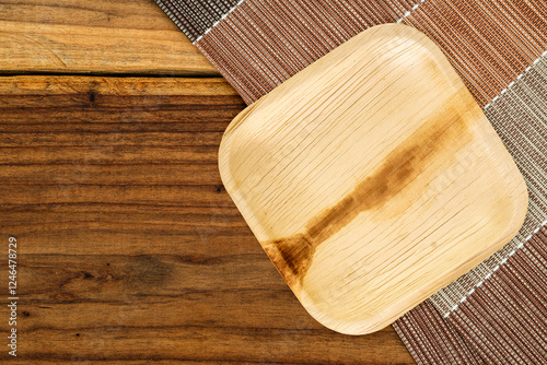 Wooden square plate on a rustic wooden table with a textured napkin. Ideal for eco-friendly dining, food styling, and natural decor.