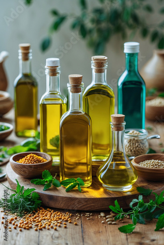 Wooden table display of green herbal oils in glass containers with aromatic seeds and leafy herb surroundings product display advertisement banner