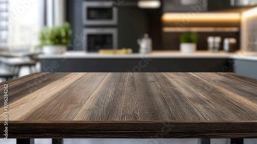 Wooden table top in focus with a modern kitchen blurred in the background, perfect for showcasing products in a stylish setting.