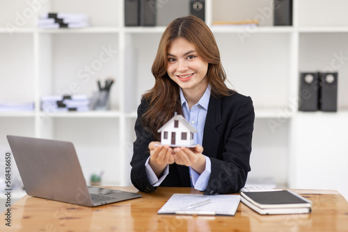 Wooden toy house with real estate agent Asian business woman signs a purchase contract mortgagefor rent sell insurance or loan for a home, Real estate concept.