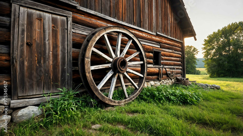 Wooden wagon wheel leaning against a stone barn in a countryside setting