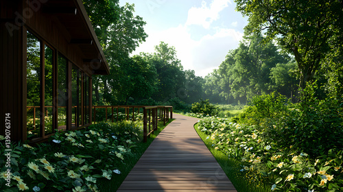 Wooden Walkway Through Lush Green Garden With Building Under Sunlight