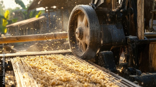 sawmill, carpenter's shop, timbering, wood, saw, wheel, vintage, rustic, machinery, industrial, texture, detail, closeup, craftsmanship, timber, carpenter's shop, rural, outdoors, agricultural, golden hour, sunlight, sawdust, particle, motion blur, yellow, brown, dark, grunge, gritty, dusty, grain, sharp, sharpened, contrast, light, shadow, background, industry, old, antique, machine, technology, cutting