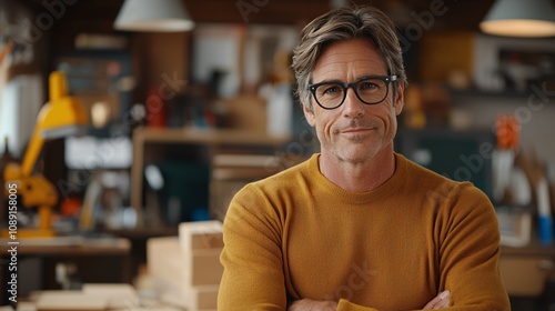 Woodwork carpentry technique concept. A thoughtful man in glasses stands confidently in a workshop, dressed in a cozy sweater, surrounded by tools and materials.