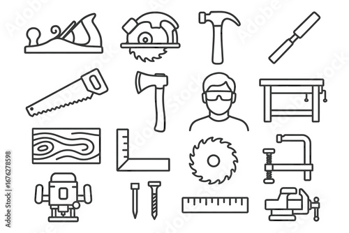 carpenter's shop, tool, saw, hammer, axe, clamp, male, goggles, ruler, workbench, planer, circular, blade, drill, nail, chisel, craftsman, timbering, hardware, screw, carpenter's shop, equipment, bricolage, construction, industrial, hand, safety, instrument, cut, wood, timber, machinery, vector, icon
