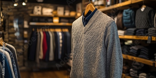 Wool pullover displayed prominently within a retail environment, showcasing the stylish wool pullover design that stands out among various other garments in the shop setting.