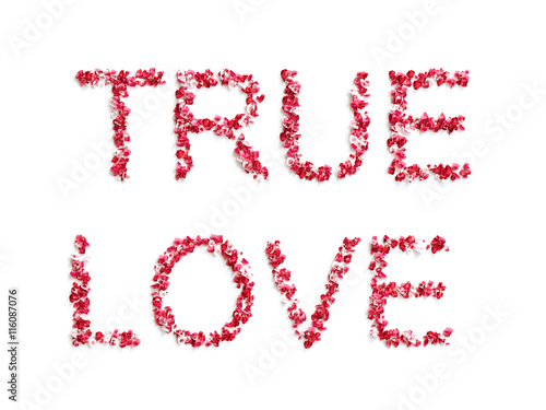 word " TRUE LOVE " made of rose petals on white background 3D render.
