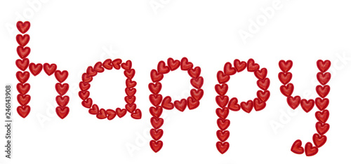 word happy, made from decorative red hearts. Isolated on white background. Concepts: ABC, alphabet, logo, symbols, love, valentines day
