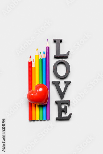 Word LOVE, heart and colorful pencils on grey background. Valentine's Day celebration