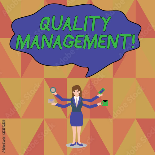 Word writing text Quality Management. Business photo showcasing Maintain Excellence Level High Standard Product Services Businesswoman with Four Arms Extending Sideways Holding Workers Needed Item