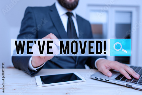 Word writing text We Ve Moved. Business photo showcasing having strong feelings sadness or sympathy has said or done Male human wear formal clothes present presentation use hi tech smartphone