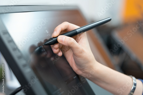 Work behind graphic drawing tablets with pen. hand on monitor with pen