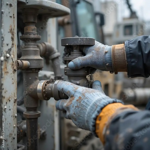Worker Adjusting Valve on Industrial Machine with Protective Gloves Closeup