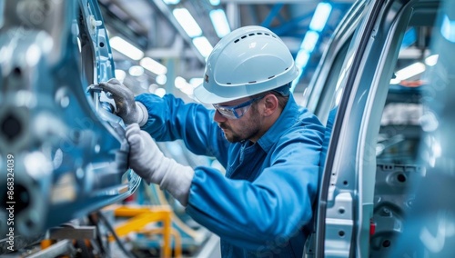 men at work, assembly, car, factory, industry, production, manufacturing, blue, machinery, engineering, helmet, safety, glove, construction, automotive, labor, workplace, industrial, metal, technology, blue-collar, technician, operation, assembly line, mechanic, process, equipment, tool, craftsmanship, mechanical, efficiency, precision, auto, transportation, hard hat, interior, assembling